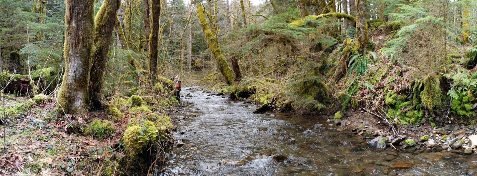 The mild, wet climate of lowland valleys in the Western Cascades promotes the growth of dense western hemlock-Douglas fir forests which give way to mountain hemlock, noble fir and Pacific silver fir at higher elevations. The riparian area at Martha Creek consists of mixed deciduous forest of red alder (Alnus rubra), Pacific dogwood (Cornus nuttallii), and large conifers including Western hemlock (Tsuga heterophylla) and Pacific silver fir (Abies amabilis). Some areas of the stream bank have dense growth of understory shrubs and devil’s club (Oplopanax horridus). [1] [5]