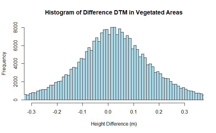 main = "Histogram of Difference DTM in Vegetated Areas", xlab = "Height Difference (m)",